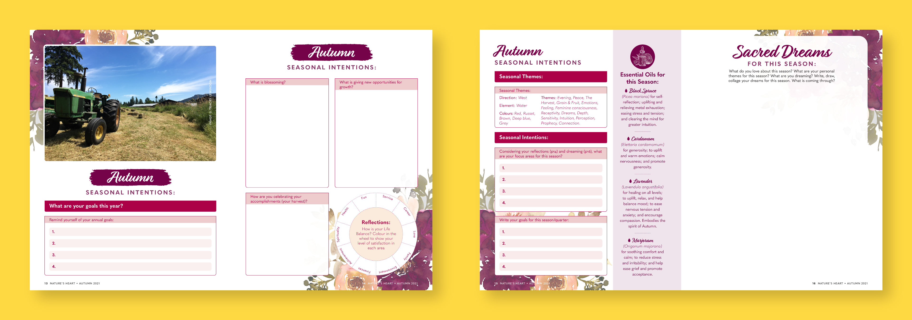 Tracey Lewindon, a Registered Aromatherapist, is committed to helping women find balance, calmness, and connection within themselves. Within her planner, Tracey's audience will discover a myriad of gentle self-care rituals and practices, centred around nature-based spirituality, kind self-reflection, healthy habit-making, and practical goal-setting. Hayley worked closely with Tracey to ensure she met her audience’s needs. The planners’ designs called for visuals that would pair with Tracey’s original artwork and photography, conveying a sense of whimsy, tenderness, and serenity. Colour played an integral part in the designs, as each season required a unique palette to reflect the colours that emerge in nature during specific times in the year. The Soul Garden is the ultimate planner for those seeking to look inwards, cultivating healthy, compassionate relationships with their inner magic.